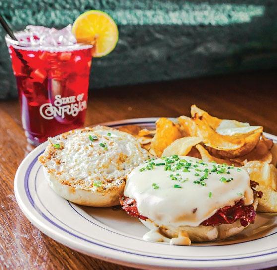 (left to right) NOLA Shrimp Po’ Boy New Orleans-style baguette, fried shrimp, lettuce, tomato, mayo. Mojito Ceviche Shrimp, mahi, citrus, cucumbers, sweet potato, red onion, mojito milk. Fried Bologna Sandwich House-made bologna, sharp cheddar sauce, fried egg.
