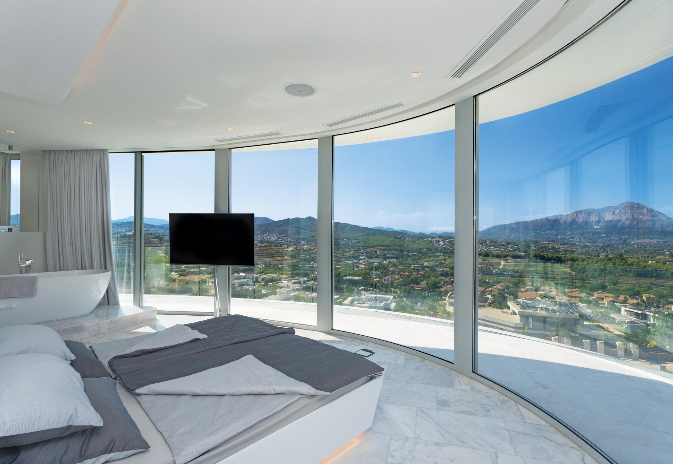 Uniquely and contemporary designed modern villa, located in the residential area of Monte Olimpo in Javea, with panoramic sea and mountain views. Designed on 2 floors, on the ground floor there is a living-dining room, fully equipped open kitchen, laundry room, guest toilets, an en-suite bedroom, all with a sea views.