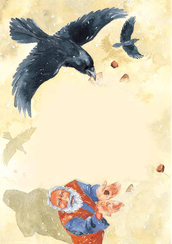 Uiteindelik het die reën ophou val . Stadig, stadig het die water weggesak . Die ark het op ’n berg tot rus gekom . Noag wou uitvind of die aarde al droog genoeg was om die ark te verlaat . Hy het ’n venster oopgemaak en ’n kraai laat uitvlieg . Toe die kraai nie terugkom nie, het Noag ’n duif losgelaat . Die aarde was nog nie droog genoeg vir die duif nie . Sy het teruggekom en Noag het haar weer by die ark ingelaat .