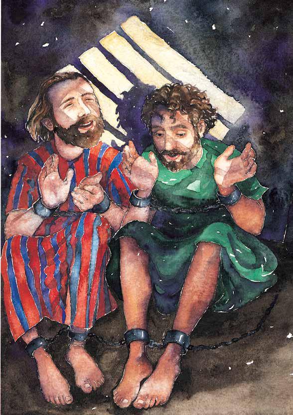 Toe dit middernag was, het Paulus en Silas in die tronk tot God gebid en lofliedjies gesing . Hulle rûe was so seer dat hulle nie kon slaap nie . Skielik het hulle gevoel hoe ’n aardbewing die fondamente van die tronk laat skud . Die tronk se deure het oopgeswaai . Die gevangenes se boeie het van hulle afgeval .