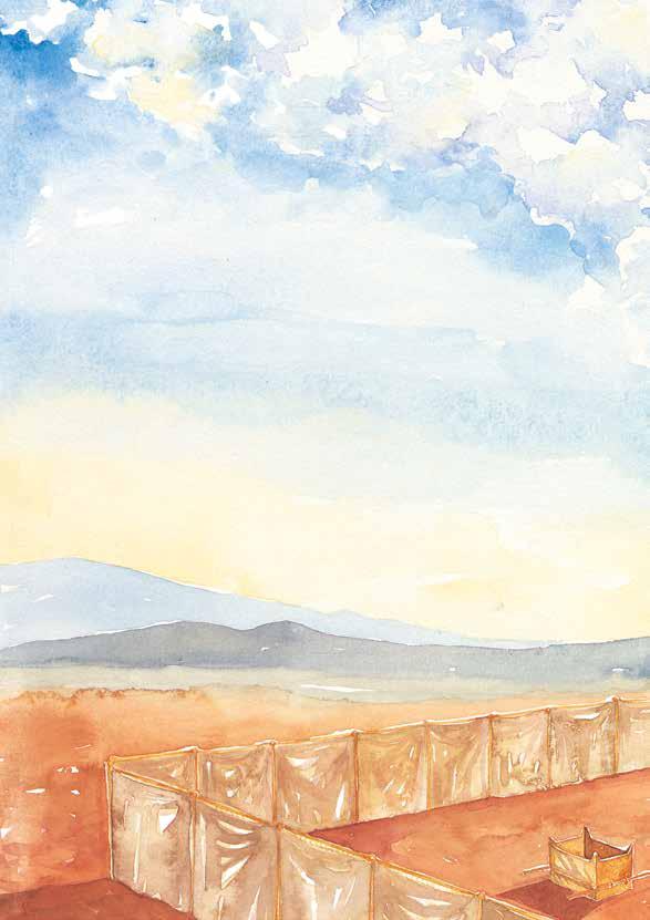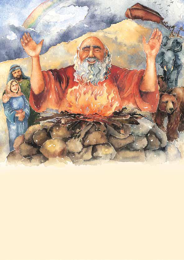 Noag het ’n hoop groot klippe op mekaar gepak en hout daarop gesit . Dit was ’n altaar waarop hulle vleis kon verbrand om op ’n spesiale manier vir God dankie te sê . Die son het deur die wolke gebreek . Toe hulle opkyk, was daar ’n pragtige, kleurryke reënboog in die lug . God het vir Noag belowe om nooit weer die aarde met ’n vloed te vernietig nie . Die reënboog was ’n teken wat almal kon sien en weet: God sal altyd sy belofte hou .