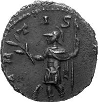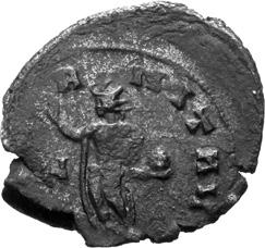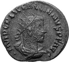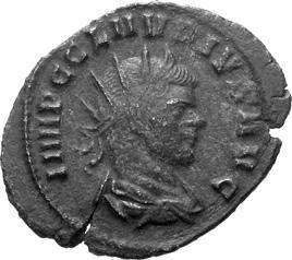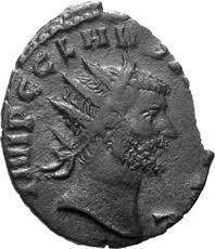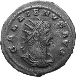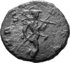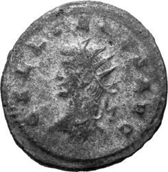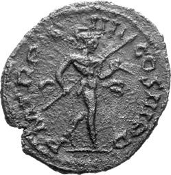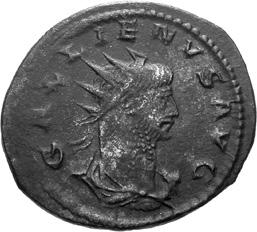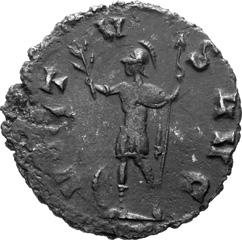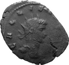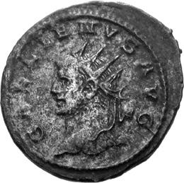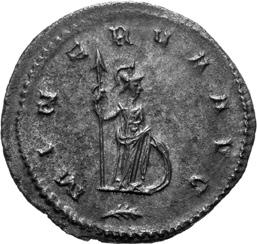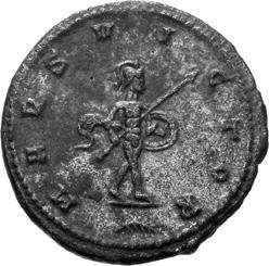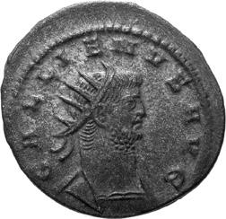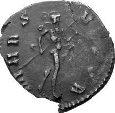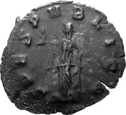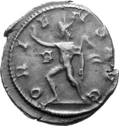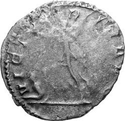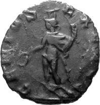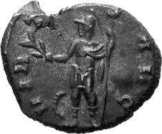 G01 Gallienus AD 253-268. Antoninianus irregular (BI; 18-20mm; 2.08g; 5h) IMP G[A] LLIENVS Radiate bust of Gallienus to right. Rev. [ ]ERO Standing male figure (Mars) with helmet holding spear in left hand and branch (?) in right; in the field to left, X (?) mt 1/ 2009 p. 124f. and pl. 17 (this coin illustrated); cf. MIR 36, 627.