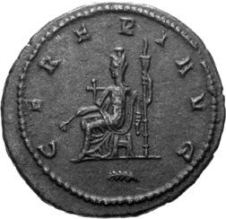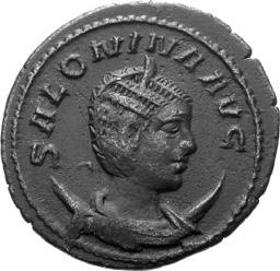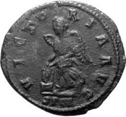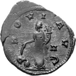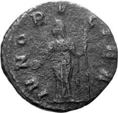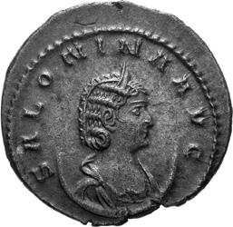 A08 Salonina, Augusta AD 254-268 Antoninianus (BI; 19-20mm; 2.75g; 4h) Siscia, 1st issue, 262-263. SALONINA AVG Diademed and draped bust of Salonina on crescent to right. Rev. IVNO RE-GINA Juno standing to left, holding patera in right hand and sceptre in left. C. 60; MIR 36, 1407mm (5 known); RIC V, I p. 111, 29.