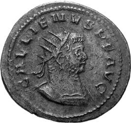 A17 Gallienus AD 253-268. Antoninianus (BI; 16-20mm; 3.35g; 6h) Siscia, 3rd issue, 266. GALL[IENV]S AVG Radiate bust of Gallienus to right. Rev. [P]A-X AVG Pax standing left, holding olive branch in right hand and sceptre left. C. 728; MIR 36, 1441i (80 known); RIC V, I p. 182, 575.