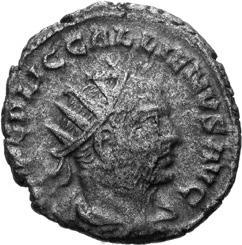 A17 Gallienus AD 253-268. Antoninianus (BI; 16-20mm; 3.35g; 6h) Siscia, 3rd issue, 266. GALL[IENV]S AVG Radiate bust of Gallienus to right. Rev. [P]A-X AVG Pax standing left, holding olive branch in right hand and sceptre left. C. 728; MIR 36, 1441i (80 known); RIC V, I p. 182, 575.