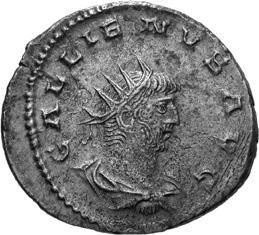 A01 Gallienus AD 253-268. Antoninianus (BI; 22-23mm; 5.09g; 6h) Siscia, 1st issue, 262263. GALLIENVS AVG Radiate head of Gallienus to right (bigger head as following coin). Rev. PA-X AVG Pax walking left, holding olive branch in right hand and sceptre in left. C. 741var; MIR 36, 1397i (22 known); RIC V, I p. 182, 576.