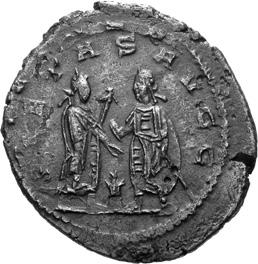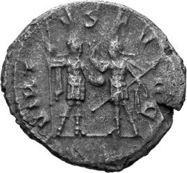 A35 Gallienus AD 253-268. Antoninianus (BI; 22-23mm; 4.76g; 6h) Samosata 1st issue, 255-256. IMP C P LIC GALLIENVS AVG Radiate, draped and cuirassed bust of Gallienus to right, seen from the back. Rev. VIRT-VS AV-GG Two emperors standing face to face, one holding vertical spear and globe, the other Victory and transverse spear. Very rare. C. 1311; MIR 36, 1681m (7 known); RIC V, I p. 104, 455.