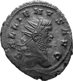 A17 Gallienus AD 253-268. Antoninianus (BI; 16-20mm; 3.35g; 6h) Siscia, 3rd issue, 266. GALL[IENV]S AVG Radiate bust of Gallienus to right. Rev. [P]A-X AVG Pax standing left, holding olive branch in right hand and sceptre left. C. 728; MIR 36, 1441i (80 known); RIC V, I p. 182, 575.