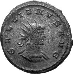A17 Gallienus AD 253-268. Antoninianus (BI; 16-20mm; 3.35g; 6h) Siscia, 3rd issue, 266. GALL[IENV]S AVG Radiate bust of Gallienus to right. Rev. [P]A-X AVG Pax standing left, holding olive branch in right hand and sceptre left. C. 728; MIR 36, 1441i (80 known); RIC V, I p. 182, 575.