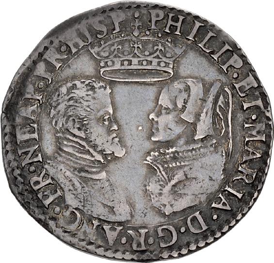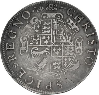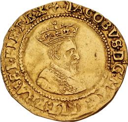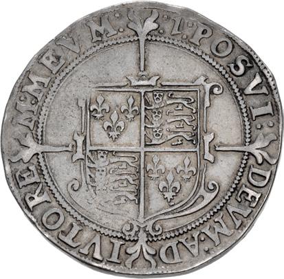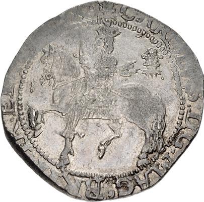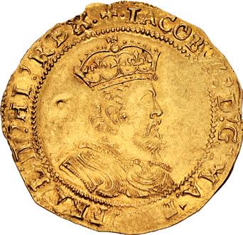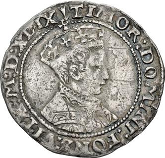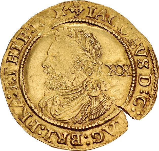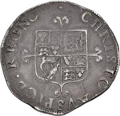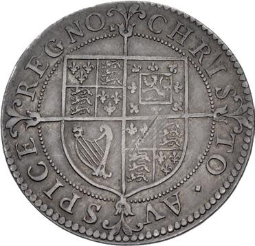 1279. SCOTLAND. James VI. 1567-1625. AR 20 Shillings (32mm, 15.06 g, 11h). Fourth coinage. Edinburgh mint. Dated 1584. Crowned and armored half-length bust left, wearing ruff and holding sword / Crowned coat-of-arms; I R and XX S (mark of value) across field. Burns –; SCBI 58 (Edinburgh), 1482 (same dies); SCBC 5489. Toned, minor edge mark. Fine. Extremely rare. ($1500)