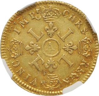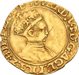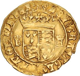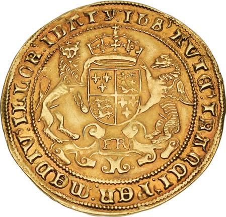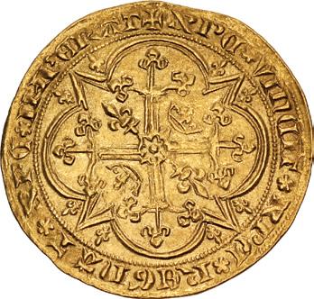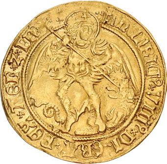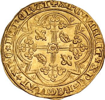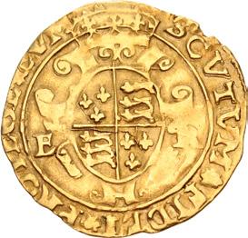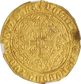 1285. ANGLO-GALLIC. Henry VI. 1422-1461. AV Salut d’or (27mm, 3.49 g, 2h). St. Lô mint. Struck 1422-1449. The Annunciation: the Virgin standing right, receiving tablet inscribed ¥ѝĚ from the Archangel Gabriel standing left; heavenly light above, two coats-of-arms below; annulet under third letter / Latin cross, with lis to left, lion passant guardant to right, and ƌ below; all within polylobe, with lis in each point; annulet under third letter. AGC 387B, 1/a; Beresford-Jones, Salutes 553/562; Schneider 122; SCBC 8164. In NGC encapsulation 6887461-007, graded MS 64. ($2000)
