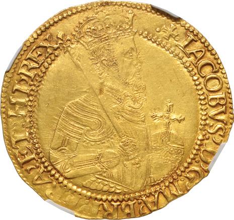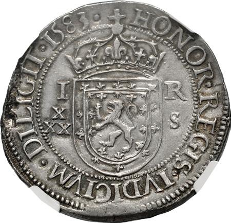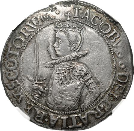 1276. SCOTLAND. James VI. 1567-1625. AR 30 Shillings (36mm, 4h). Fourth coinage. Edinburgh mint. Dated 1583. Crowned and armored half-length bust left, wearing ruff and holding sword / Crowned coat-of-arms; I R and X/XX S (mark of value) across field. Burns 3 (fig. 933); SCBI 58 (Edinburgh), 1464-6; SCBC 5487. Toned. In NGC encapsulation 2478910001, graded AU 50. ($2000)