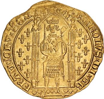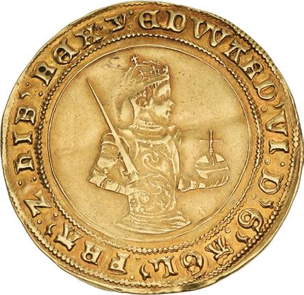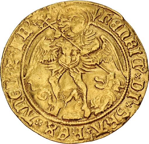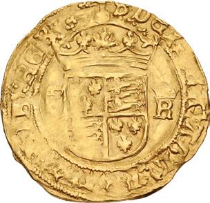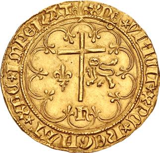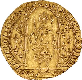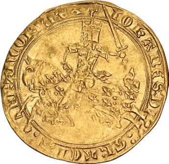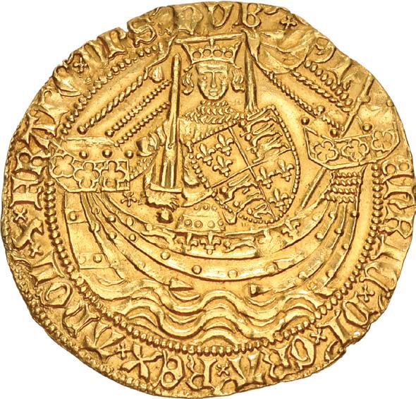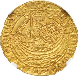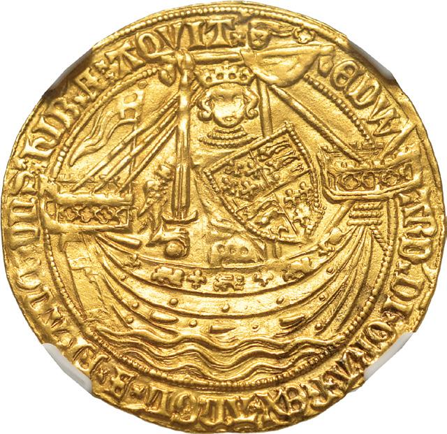 1284. ANGLO-GALLIC. Edward the Black Prince. As Prince of Aquitaine, 1362-1372. AV Noble guyennois à la rose – Pavillon d’or (31mm, 5.28 g, 4h). La Rochelle mint. Struck 1362(?). Edward wearing rose wreath, standing facing, holding sword up in right hand and raising left hand; at feet, two leopards couchant; to left and right, two ostrich feathers with tips curved inward; all within ornate Gothic portico / Ornate cross quernée with rose in center, lion passant and lis in opposite quarters; all within arched quatrefoil set on quadrate frame with roses in angles; pelleted cinquefoils in spandrals. AGC 157A, 8/o; cf. Schneider 47 (for type); SCBC 8123. In NGC encapsulation 6865696-046, graded MS 62. ($5000)