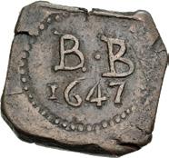 1282. IRELAND, The Great Rebellion. Issues of the ‘Cities of Refuge’. Bandon Bridge. 1642-1649. Æ Farthing (14mm, 2.32 g, 6h). Dated 1647. B • B/ 1647 / Three castles. An unrecorded dated issue, but cf. D&F 316 and SCBC 6560 for undated issue. Brown surfaces. VF. Extremely rare and apparently unrecorded. ($1500)