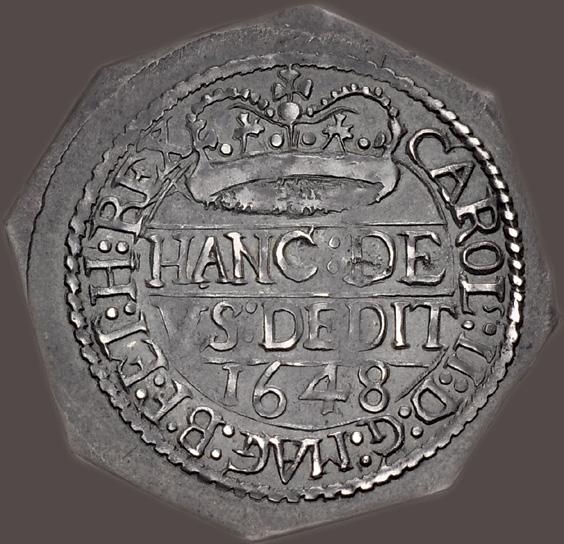 1283. IRELAND, The Great Rebellion. Issues of the ‘Cities of Refuge’. Kinsale. 1642-1649. Æ Farthing (16mm, 3.51 g, 12h). Coat-of-arms / K : S. D&F 318; SCBC 6563; Noonan’s 259, lot 786 (same dies). Brown surfaces, flan flaw. VF. Very rare this fine. ($1500)