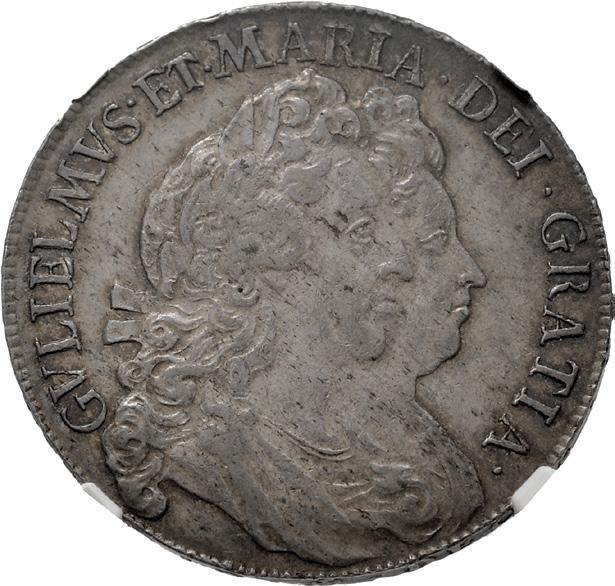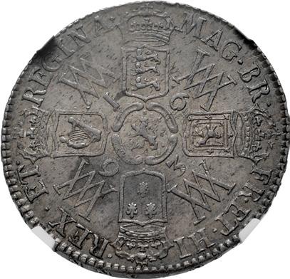5686073. STUART (ORANGE). William III & Mary. 1688-1694. AR Halfcrown. Dated 1693 and RY QVINTO. Second busts, third shields. Bull 861; ESC 519; SCBC 3436. Lightly toned with significant luster. In NGC encapsulation 2153870042, graded MS 60. $2675