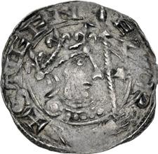 5663761. NORMAN. Henry I. 1100-1135. AR Penny (20mm, 1.33 g, 2h). Double Inscription type (BMC xi). London mint; Ælfwine, moneyer. Struck circa 1115. Crowned and draped bust left, holding cross-tipped scepter in right hand; two quatrefoils before face / [ ม ¨ ] ⌦ዟ ዩዢn ዞ [ ɭ ]/ ม n ⌦⎍nዝዞ / , small cross pattée; quatefoils-in-annulets in outer legend. SCBI –; EMC 1200.0904 and1 990.0212 var. (obv. legend); BMC 76 var. (same); North 867; SCBC 1272. Toned, reverse off center, official edge snick. VF. Good portrait. Rare. $3950