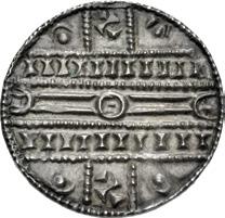 5682679. DENMARK. Svend II Estridsen. 1047-1075. AR Penny (17mm, 1.05 g). East Danish standard. Roskilde mint. Openwork cross fleurée with central pellet-in-annulet, triple pellets in three of the voids and trefoil terminals on three of the bars, upper bar consisting of small globe set on larger globe; all within large open linear convex cross with pellet terminals and joined at ends by double line / Ornate “tapestry” pattern: central design consisting of pellet-in-annulets joined by double lines; on either side, IIIIIOIII and IICIIDII within pelleted border; at outer ends, cross pattée within pelleted border; pellet and crescent in outer voids. Becker Collection 104 (same obv. die); Hede II 53; cf. Hauberg 36 (for type). Richly toned. EF. $1750