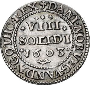 5682684. DENMARK. Christian IV. 1588-1648. AR 8 Solidi (24mm, 2.74 g, 12h). København (Copenhagen) mint. Dated 1603. Elephant left with mahout, banner, and tower containing soldiers / Denomination and date in three lines. Schou 9; Hede 74; KM 15. Toned. Good VF. Rare. $3950