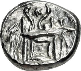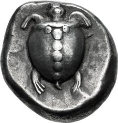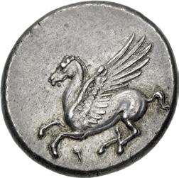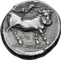 In 510 BC, Kroton destroyed its rival, Sybaris. Current scholarship indicates that the city of Temesa was associated with Sybaris, and that, following the destruction of the latter, Temesa came under the domination of Kroton. Around this time, the present issue was struck at Kroton, while a similar issue was struck at Temesa (HN Italy 2566). It has been thought that these parallel coin issues represented a military alliance between the cities, apparently based on the military nature of the iconography. However, no historical record of such an alliance exists. Both coins exhibit a tripod on the obverse and a helmet on the reverse. Rather than the helmet indicating a military purpose, it is more likely that it is simply the civic badge of Temesa, and therefore each city’s badge appears on the coins. As such, it is more likely that the coinage represents a political/civic alliance between Kroton and Temesa. The Temesan coins also feature a pair of greaves on the obverse, which may be an attribute of that city’s most prominent deity, Polites (see Strabo, VI.1.5).