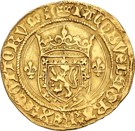5682811. SCOTLAND. James II. 1437-1460. AV Lion (26mm, 3.36 g, 6h). Second coinage. Edinburgh mint; im: crown. Struck 1451-1460. ՟ Ʃ⌃æɨÙѝS ĕĚƩ Żˊ⌃ Ḻ ˊĚҢ Ḻ Sæɨ˶˶ɨˊѝ⍴ Ḻ , crowned coat-of-arms; lis flanking / ՟ Ң Pæ Ḻ ˊĚŻɀ ⌃˶ Ḻ ҢP æ ѝƩɀæƩ˶ Ң P , St. Andrew crucified on short cross saltire; crowned lis flanking. Burns 5 (fig. 525; same dies); SCBI 35 (Ashmolean & Hunterian) 691 (same obv. die); SCBC 5222. A few scratches and edge marks. VF. $7750
