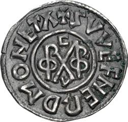 5686076. ANGLO-SAXON, Kings of Wessex. Alfred the Great. 871-899. AR Penny (19mm, 1.13 g, 5h). Lunettes type (BMC i). Canterbury mint; Sæferth, moneyer. Struck 871-circa 875. ม ⍒⌓⌦Bያ⌓ዝḦ ያ⌓ҟ , small diademed bust right breaking inner circle / ⌽⌓⌘ያ⌓ዝ across central field; /ዦɭ⌱/ /⌓˶⍒Ḩ in lunettes above and below. Lyons & Mackay, Lunettes, Group 1, Dies B/b, AfL1.104 (this coin); cf. SCBI 42 (South-Eastern), 742; cf. BMC 166; North 625; SCBC 1057. Well struck with a dark matte tone. Near EF. Very rare. $12,500