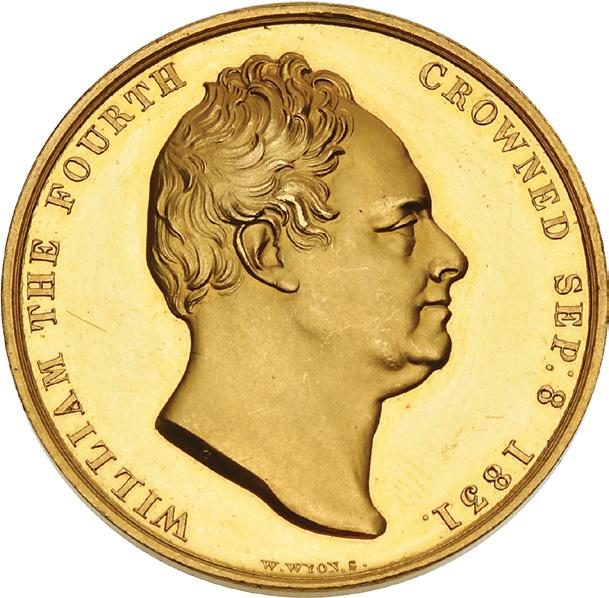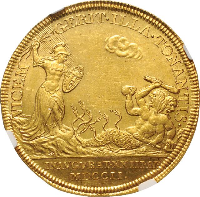 1138. HANOVER. Victoria. 1837-1901. AV Medal (36mm, 30.46 g, 12h). Coronation. By B. Pistrucci. Dated 28 June 1838. VICTORIA D. G. BRITANNIARUM REGINA F. D., draped bust left, wearing bandeau / ERIMUS TIBI NOBILE REGUM, Victoria seated left on throne, holding scepter and orb, and receiving crown from Britannia, Hibernia, and Scotia standing to left; to far right, lion standing facing, with forepaw resting upon thunderbolt; in three lines in exergue, INAUGURATA/ DIE JUNII XXVIII/ MDCCCXXXVIII. BHM 1801; Eimer 1315. In NGC encapsulation 6906580-007, graded MS 61. ($10,000)