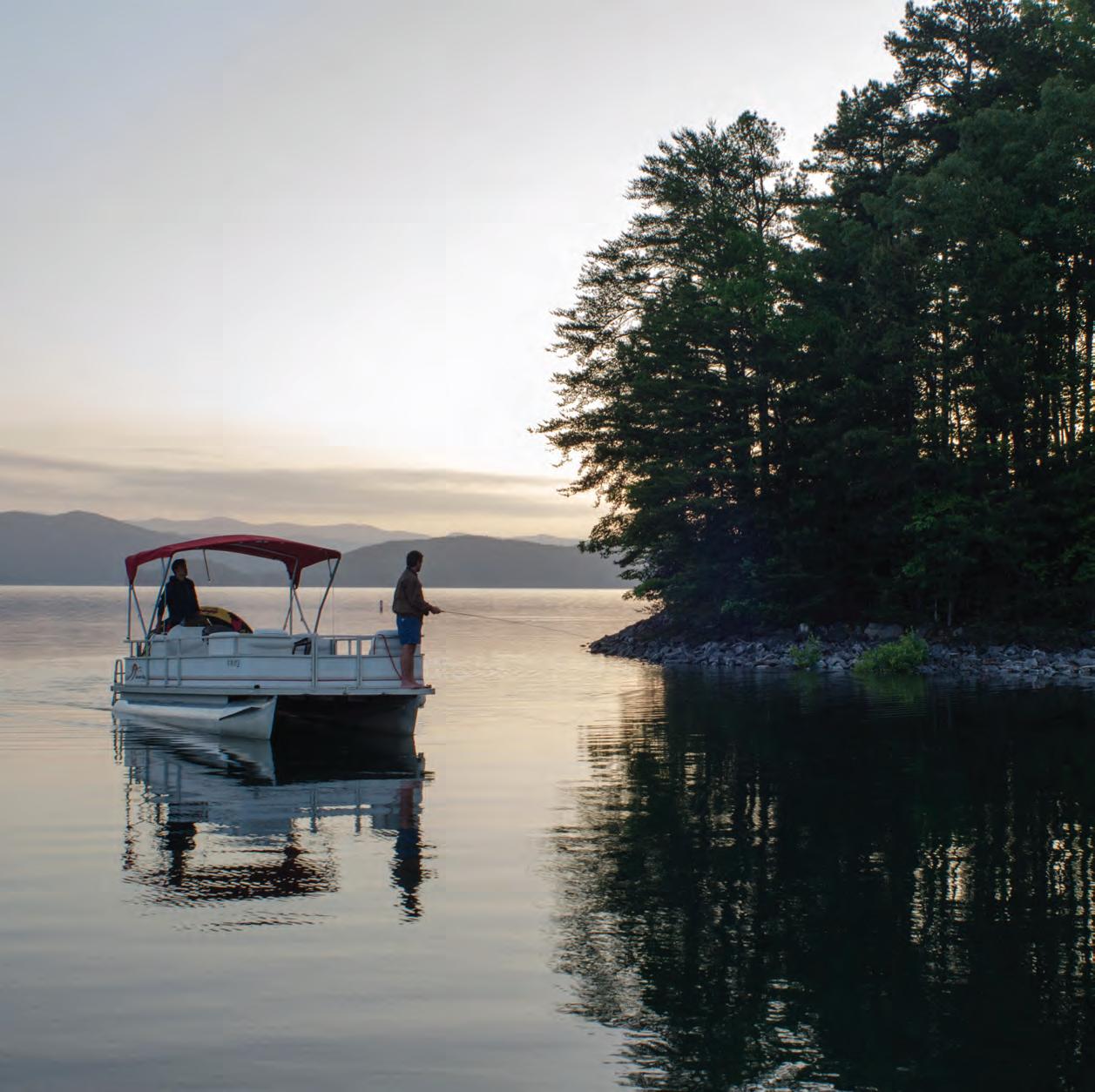 If you’d rather be under the water, Jocassee is a world-renowned freshwater diving desti-nation that boasts visibility of more than 50 feet at depth. Lake Jocassee Dive Shop offers lessons and guided trips to see “The Wall,” where a section of mountain was blasted to build the dam, or a 40-foot swimthrough wooden sailboat.