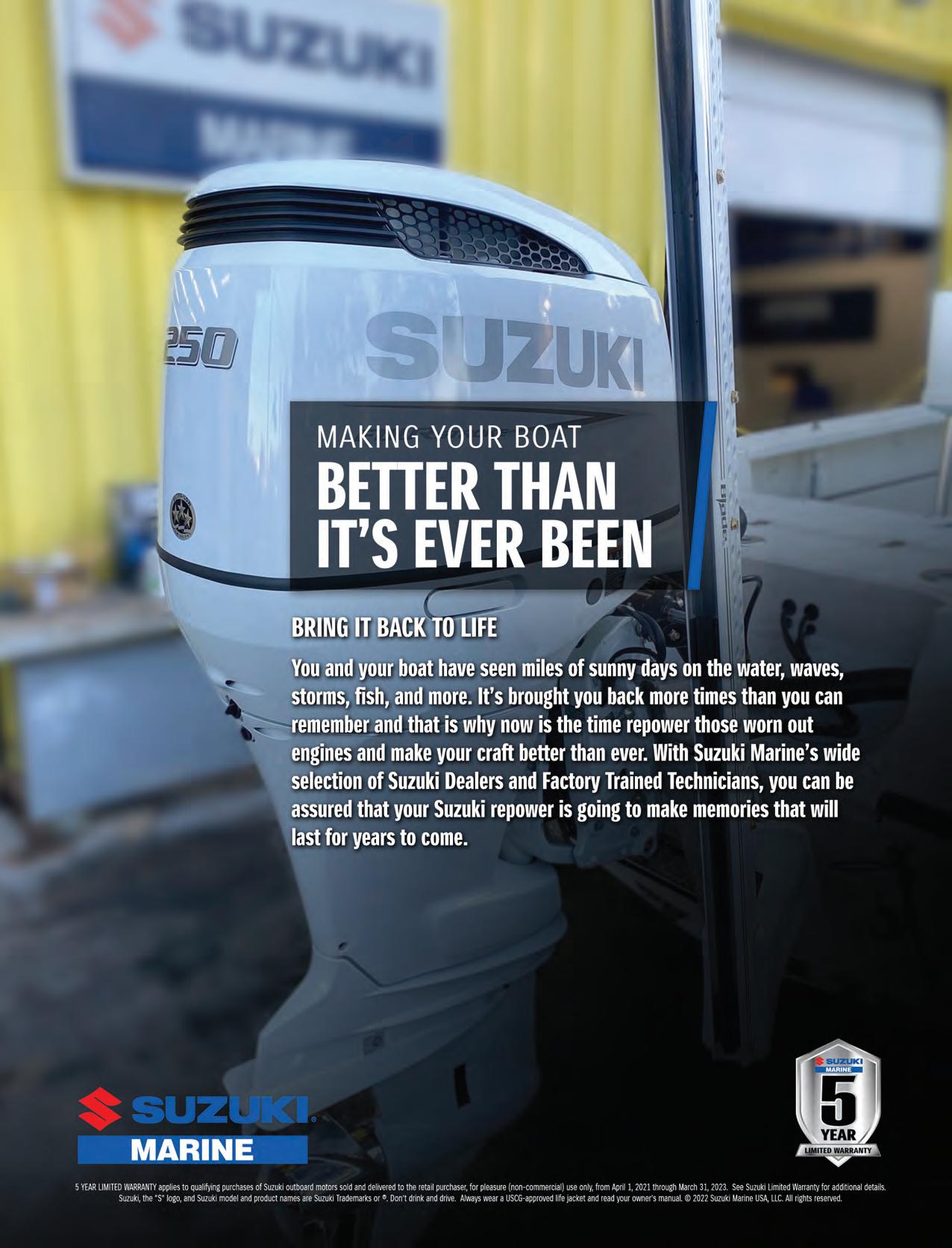 To learn more about Suzuki’s Clean Oceans Project or the company’s complete line of clean-running 4-stroke outboards from 2.5 to 350 horsepower, visit www.suzukimarine.com or call (714) 996-7040.