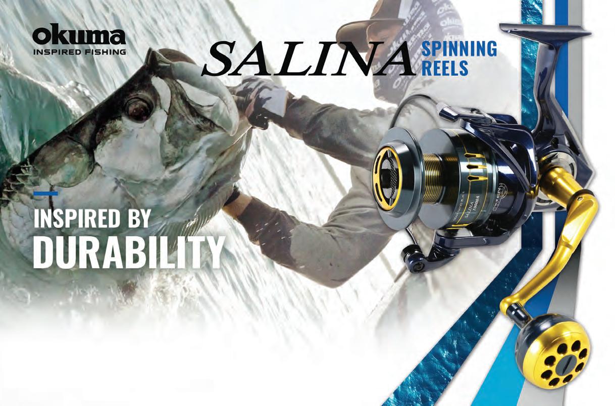 Salina spinning reels feature a hybrid carbonite and Japanese felt DFD drag system that outputs more than 33 lbs of fish stopping power. Constructed from advanced LITECAST body material that is 15% lighter than die-cast aluminum, these reels are built for both light inshore and heavy offshore use. With an interchangeable screw-in handle system and six available models from 4000 to 14000, Salina spinning reels are designed to maximize your success on the water.