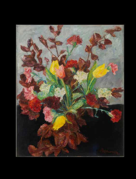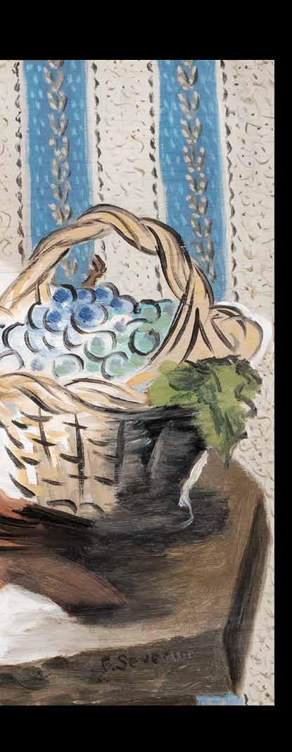 In questa “Natura morta”, l’artista combina oggetti quotidiani, come cesti di frutta, una brocca decorativa e una candela, con un piccolo uccello, creando un’atmosfera serena e domestica. La composizione è equilibrata, caratterizzata da forme stilizzate e colori caldi, che suggeriscono un legame con il Classicismo e il Cubismo sintetico, movimenti che influenzarono Severini dopo la sua fase futurista. La trama dei dettagli, come i motivi del tessuto sullo sfondo, aggiunge una dimensione intima, mentre le pennellate evidenziano la sensibilità tattile degli oggetti.