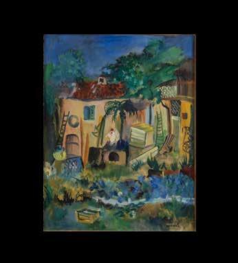 “Boutique della riviera”, 1961, olio su compensato, firmato e datato in basso a destra, titolato e datato sul retro, entro cornice 49x60 cm.
