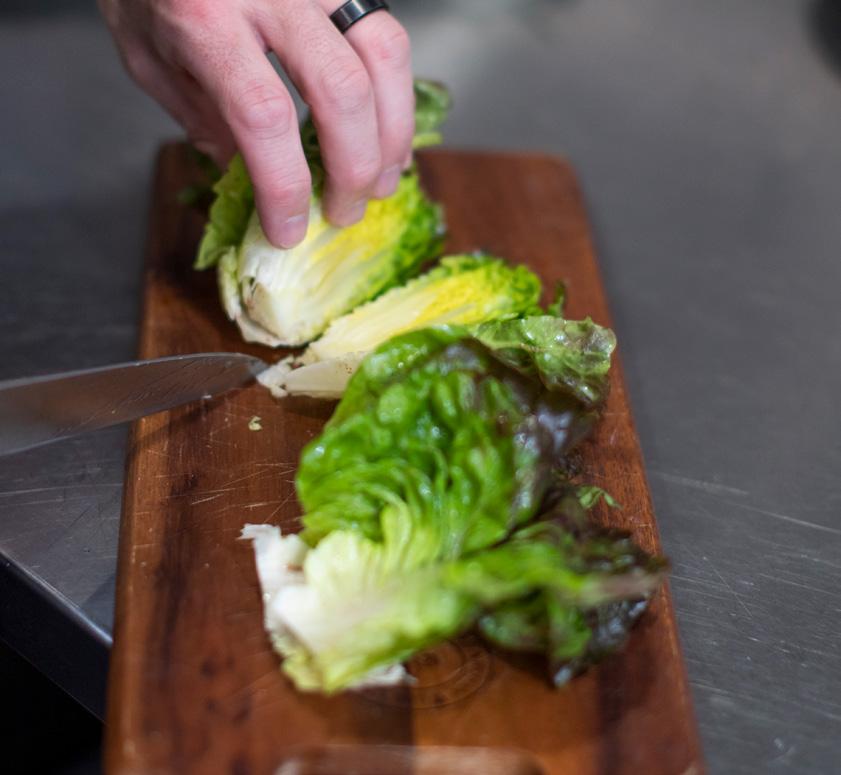 Quarter little gem lettuces lengthwise with stem end attached to keep wedges intact.