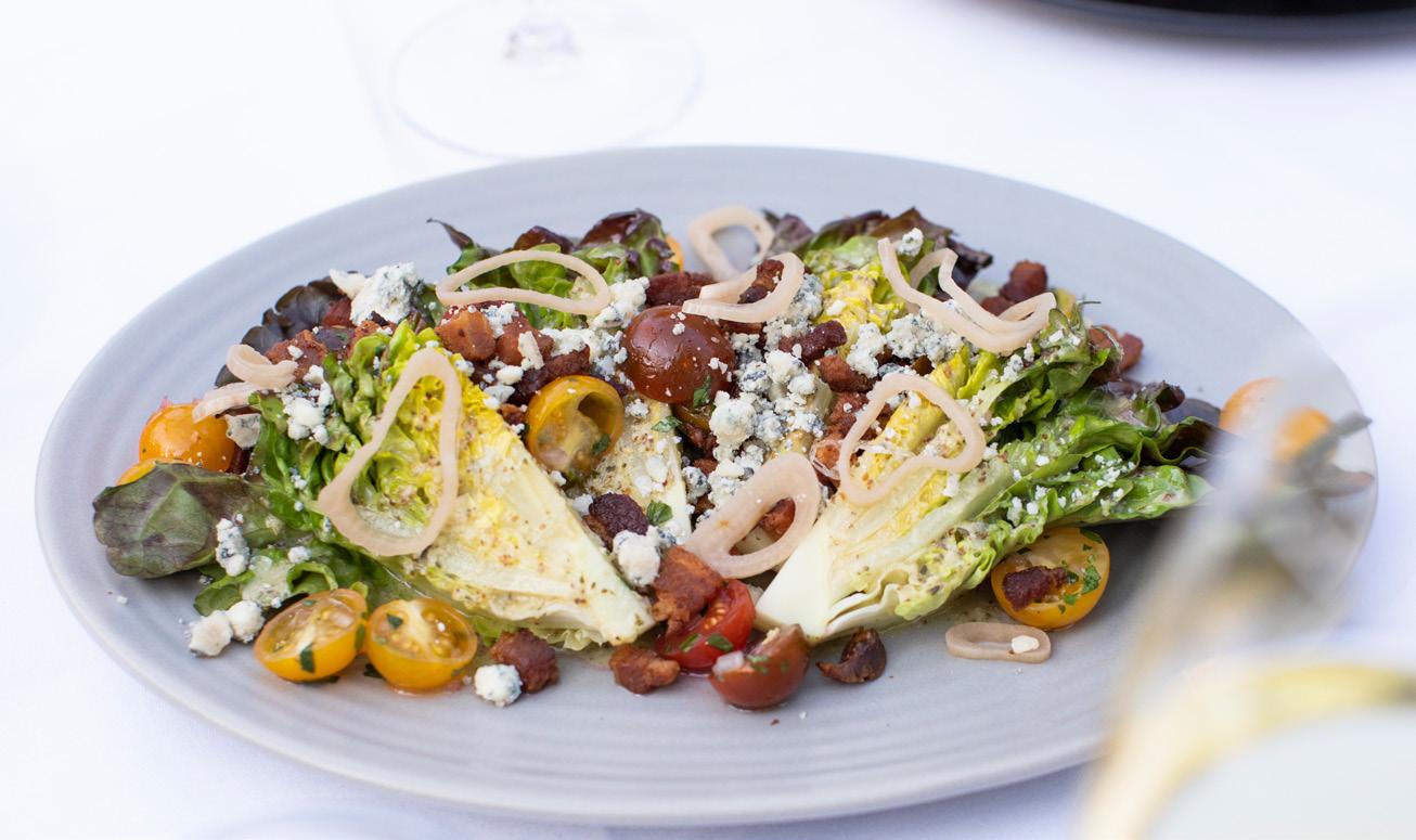 Place dressed lettuce wedges onto a plate and garnish with your desired amounts of cherry tomatoes, bacon, Bay Blue cheese and pickled shallots.