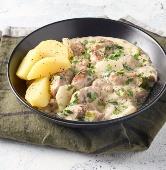 2 Placez le filet de porc dans un plat à four et répartissez sur le dessus la moitié du beurre en noisettes. Glissez la viande ± 25 min au four préchauffé. Mettez les gratins dauphinois surgelés dans un autre plat à four et faites-les cuire avec la