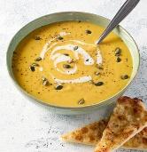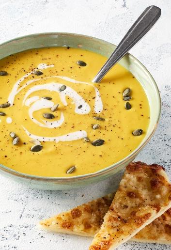 7 Versez la soupe dans des bols. Décorez de traits de lait de coco restant et de graines de potiron. Servez avec un morceau de pizza.