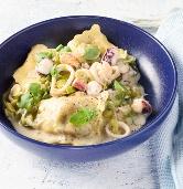 5 Entre-temps, faites cuire les tagliatelles dans de l’eau bouillante légèrement salée (voir temps de cuisson sur l’emballage). Égouttez les pâtes et mélangez-les à la sauce.