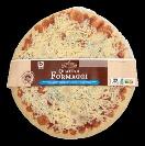 6 Déroulez la pâte à pizza avec son papier cuisson sur une plaque de four et enduisez-la de l’huile d’olive restante. Répartissez-y les fromages râpés et poivrez. Glissez la pizza 15 min au four préchauffé.