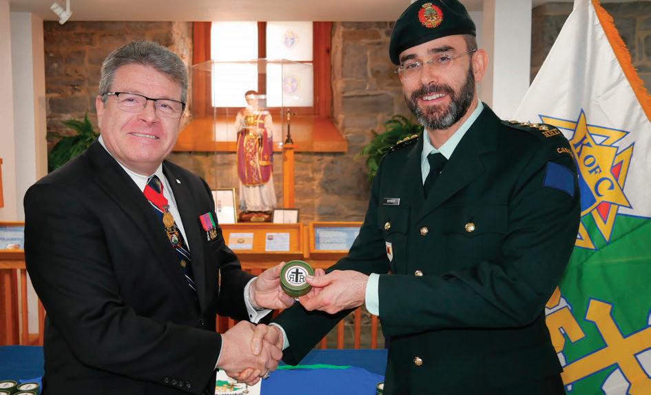 presents a rosary to Army Capt. Richard Bernier, chaplain to the Royal Highland Regiment of Canada, also known as the Black Watch. The Ontario State Council donated about 30 rosaries — replicas of a rosary issued to soldiers in World War I — to Capt. Bernier for distribution to service members.