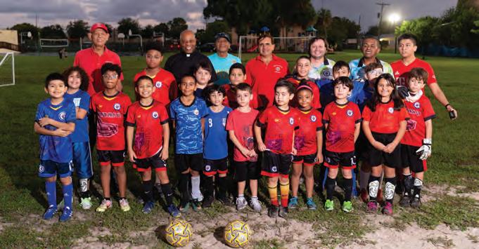 Past Grand Knight Walter Silva (back row, center) of San Eugenio de Mazenod Council 17299 in Miramar, Fla., coaches, and Father Franky Jean, pastor of St. Stephen Protomartyr Catho lic Church, stand with players from the council’s youth soccer program.