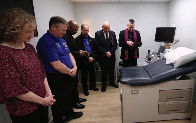 Members of Christ the King Council 9257 in Milwaukie, Ore., pray as Msgr. John Cihak (back right), pastor and council chaplain, blesses a new ultrasound machine at First Im age Pregnancy Resource Center in Portland. The council helped raise more than $125,000 to purchase three ultrasound machines for the center’s three local offices.