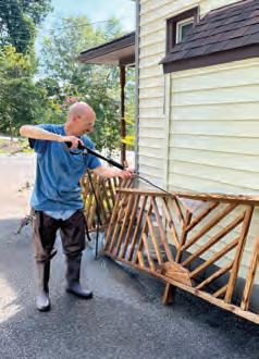 Deputy Grand Knight Tom Behrmann of Stanley E. Fiko Council 1404 in Bluefield, W. Va., power-washes a porch railing at Abel Pregnancy Re source Center. Council mem bers cleaned and resealed the center’s front porch, helping it save money as demand for its services increases in the wake of the U.S. Supreme Court’s Dobbs decision.