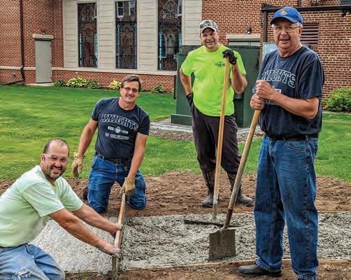 Grand Knight Ken Lemere (left) and other members of Oconto (Wis.) Council 1475 pause a moment while constructing a 140-foot side walk at Holy Trinity Parish. The council donated more than $1,000 and 90 service hours toward the project.