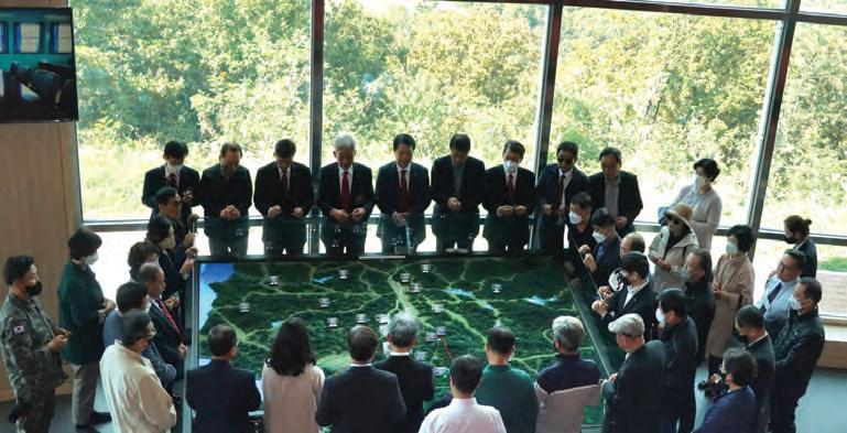Knights and their families pray a rosary for peace at the Odusan Unification Tower, an observatory near the border between South Korea and North Korea. The Knights also attended Mass, celebrated by Bishop Titus Seo Sang-bum, at the only Catholic church in the Joint Security Area. Several Knights were instrumental in designing and constructing the church, which opened in 2019.