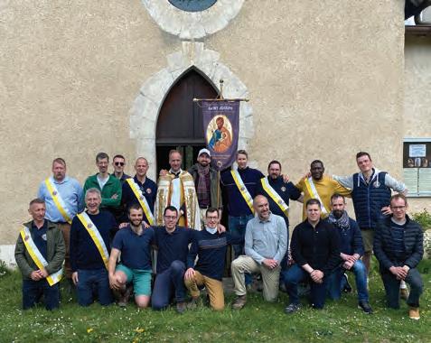Members of St. Joan of Arc Council 17198 in Domrémy-la-Pu celle stand in front of Notre-Dame-de-Bermont Chapel and hermitage in Bermont. The Knights were making a pilgrimage to the site, where the council’s namesake would often come to pray and present flowers to the Blessed Mother.