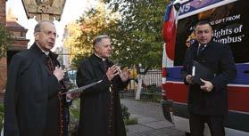 Od lewej: Najwyższy Kapelan, abp William Lori, metropolita lwowski abp Mieczysław Mokrzycki i Były Delegat Stanowy Youriy Maletskiy przygotowują się do ceremonii poświęcenia karetki. Lwów, 21 października 2024 roku. Karetka jest darem od Rycerzy Kolumba dla szpitala w Czarnomorsku. • Najwyższy Kapelan uczestniczy w rozdawaniu kurtek w ramach inicjatywy Kurtki dla Dzieci w Irpieniu, 19 października 2024 roku.
