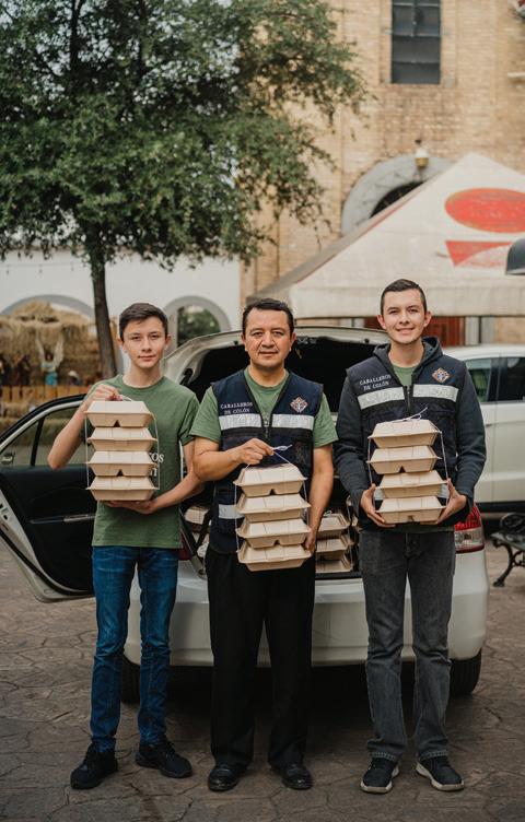 Left: Javier Mesta Arriaga (center) and his sons Alejandro (left) and Arturo of Nuestra Señora de Monterrey (Mexico Northeast) Council 2312 carry meals for people in need. The council distributes more than 60 meals on a weekly basis.