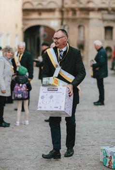 A Polish Knight carries baby supplies donated by Knights and families participating in the jurisdiction’s annual pilgrimage to Jasna Góra Monastery. The Knights collected diapers and other essentials for the maternity home run by Caritas of the Archdiocese of Częstochowa.