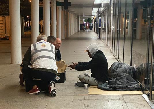 Above: Knights from Blessed Noël Pinot Council 17698 in Béhuard visit with a man living on the streets of Angers. The council regularly walks the city’s streets in the early mornings to minister to people experiencing homelessness and provide them with essential supplies.