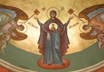 An icon depicts the Virgin of the Sign, a traditional image of the Theotokos (“Godbearer”). The archangels Michael and Gabriel bow in adoration before the Christ Child on Mary’s breast, which symbolizes her womb. The Virgin of the Sign is sometimes also called “She whose womb is more spacious than the heavens.”